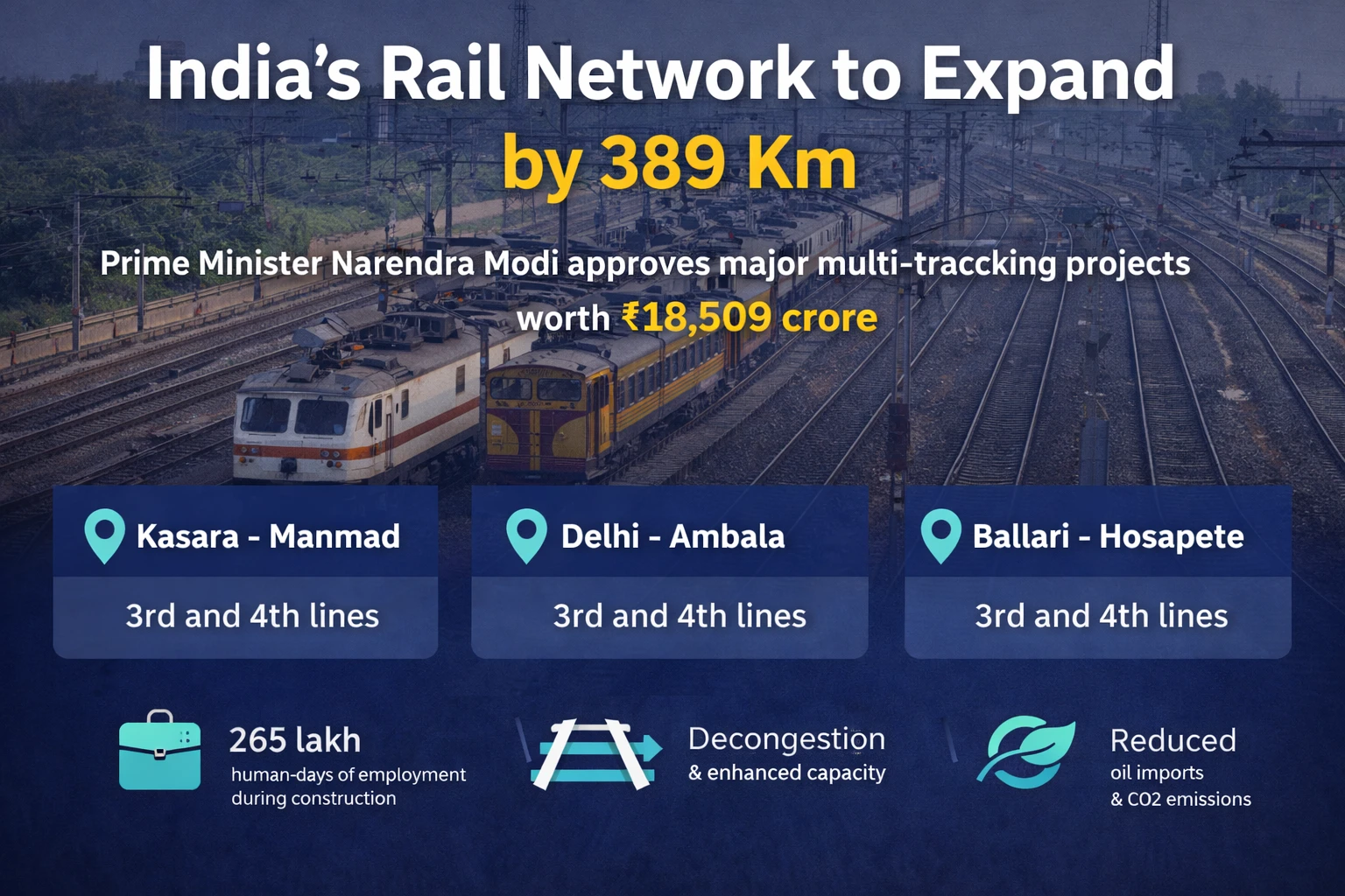 The approved projects will add approximately 389 kilometers to the existing Indian Railways network and are expected to be completed by the 2030-31 fiscal year. The specific routes identified for the construction of 3rd and 4th lines include: